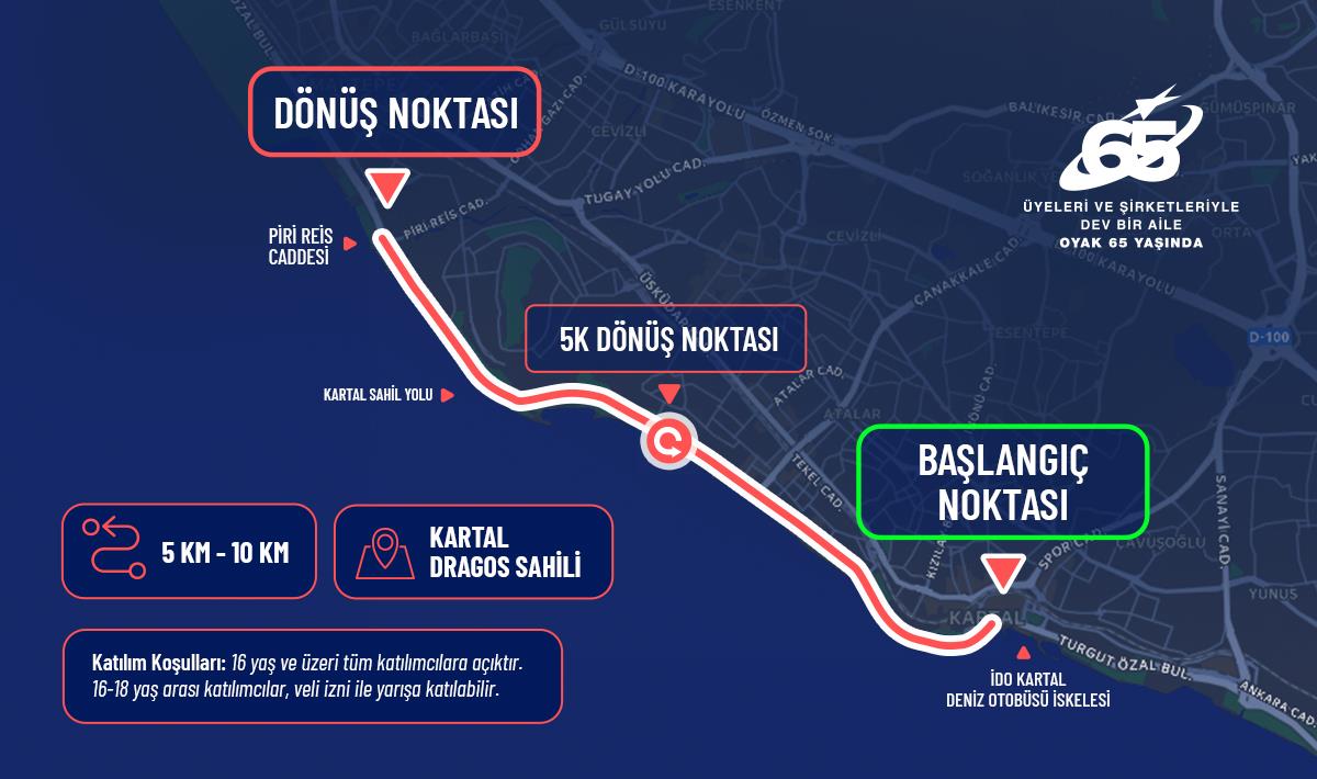 İstanbul Anadolu Yakası’nın en keyifli sahil hatlarından biri olan Kartal Dragos Sahili, bu kez OYAK 65'inci Yıl 10K Koşusu’na ev sahipliği yapıyor. Marmara Denizi’nin ferah atmosferi ve Adalar manzarası eşliğinde uzanan parkur, geniş ve akıcı sahil hattıyla koşuculara hem hızlı hem de keyifli bir yarış deneyimi sunuyor.
